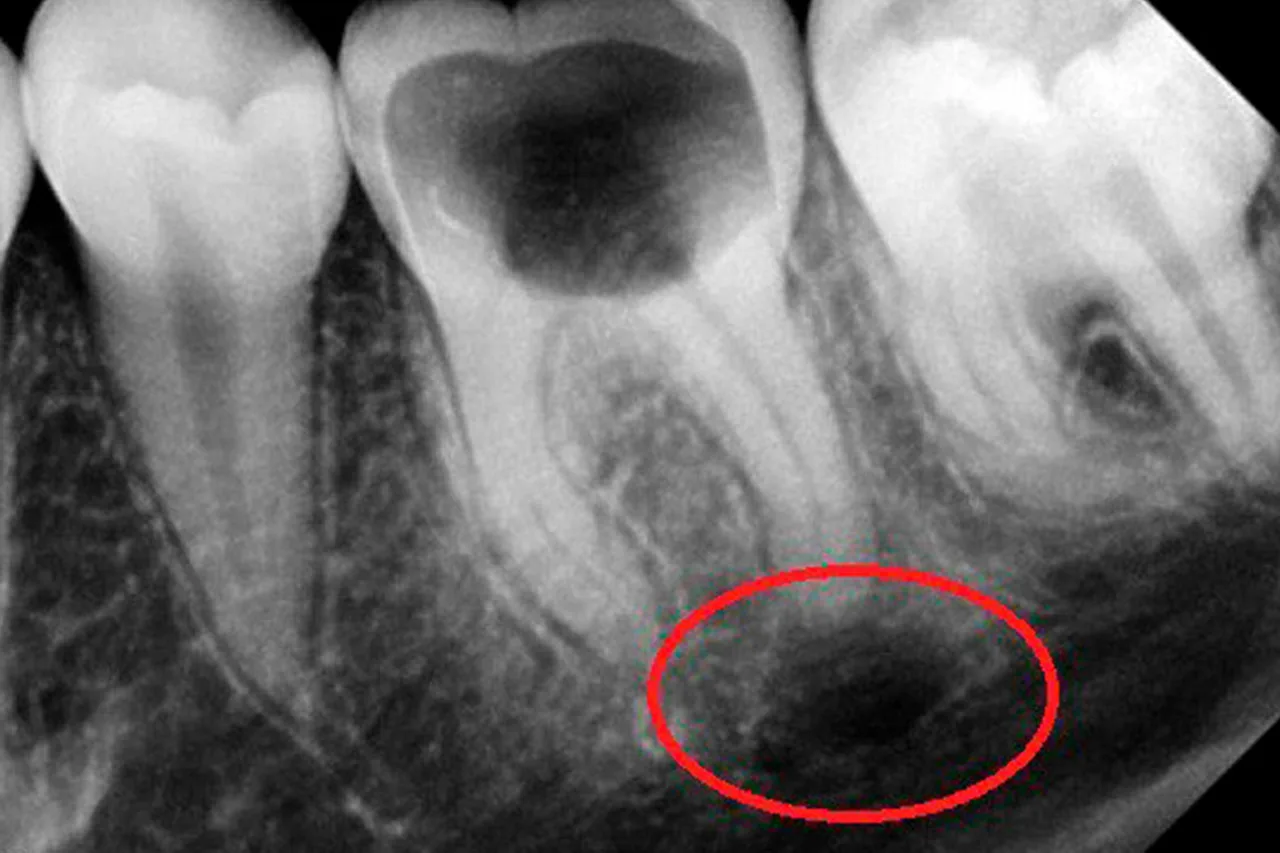 گاهی اوقات، در پاسخ به عفونت قدیمی یا باکتریهایی که مدتها در ناحیه انتهای ریشه باقی ماندهاند، ساختاری پر از مایع به نام کیست ریشه (Periapical Cyst) در استخوان فک تشکیل میشود. این کیستها ممکن است برای سالها بدون علامت باقی بمانند، اما با رشد و بزرگتر شدن، میتوانند به استخوان فشار وارد کرده و باعث ایجاد درد، تورم و ناراحتی شوند. وجود کیست معمولاً توسط عکسهای رادیوگرافی تشخیص داده میشود و اغلب نیازمند درمانهای تخصصی مانند جراحی اپیکوکتومی است.